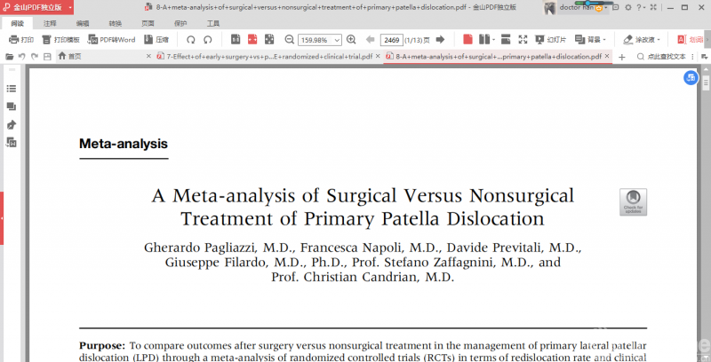 结果显示与保守治疗组相比手术治疗组短期并发症更多但是再脱位率更低(24-44个月),长期随访结果2种治疗方式没有显著性差异(72-86个月)。本文的限制是手术和非手术治疗初次创伤性髌骨脱位(PLD)的治疗方式上存在较高的异质性,例如手术方式有MPFL重建术、 MPFL修复术等,这对2种治疗方式的临床效果评估有一定影响。