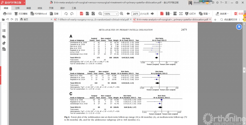 初次创伤性髌骨脱位的治疗仍然是关注的热点领域,一项系统评价和meta分析主要比较了手术治疗和非手术治疗初次创伤性髌骨脱位的临床疗效。