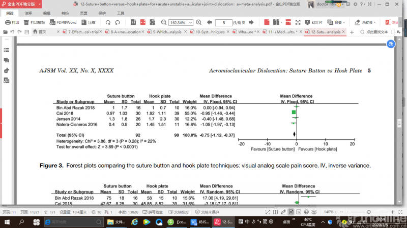 近期多项研究评估了肌腱移植和新技术治疗严重肩锁关节脱位的的手术效果和成本效益。一项meta分析比较了纽扣钢板和钩板固定治疗急性不稳定肩锁关节脱位的临床效果,结果显示纽扣钢板治疗的临床效果更好且疼痛评分更低。两种固定技术在并发症、术后肩锁关节复位丢失、手术时间等方面无显著差异。
