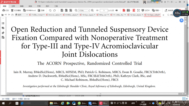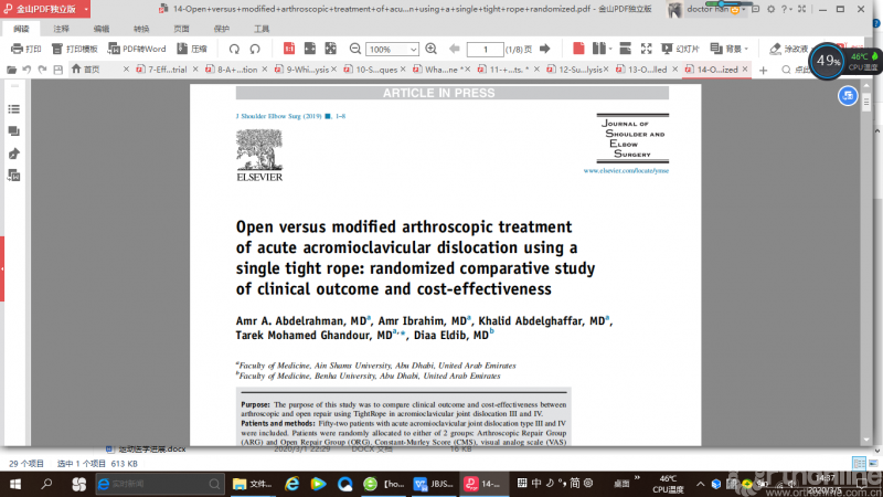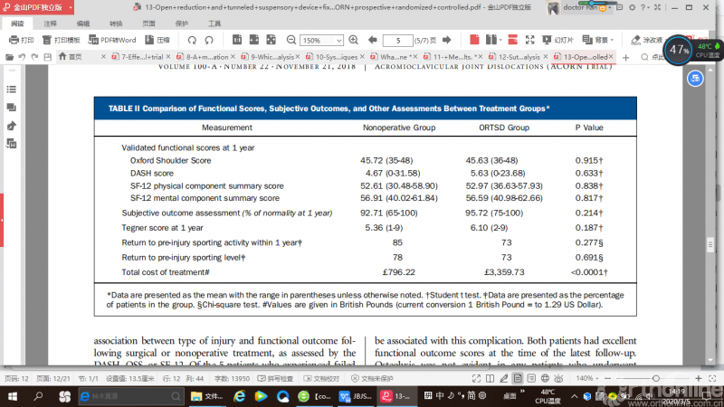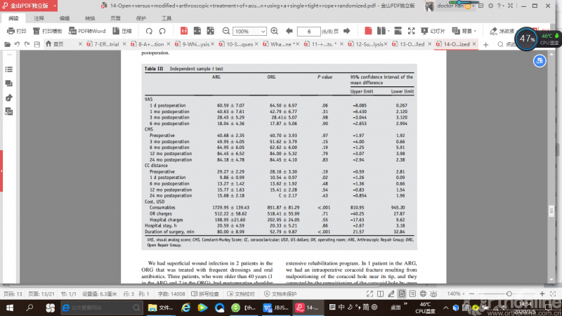 来自阿布扎比的一项随机对照研究(RCT),比较了关节镜手术和开放手术治疗急性肩锁关节脱位的临床效果,作者发现与开放手术相比,关节镜手术花费更多且手术时间更长。术前和术后第一天CC距离(术前关节镜组29.2 mm,开放手术组28.1 mm)(术后第一天,关节镜组9.8 mm,开放手术组10.5 mm) 有统计学意义上的改善(P <.001)。然而,术后6个月CC距离(关节镜组患者13.2 mm, 开放手术组13.6 mm)和术后1年(关节镜组15.7 mm, 开放手术组患者15.4 mm) 与术后第一天相比CC距离均有增加,差异有统计学意义(CC距离是指锁骨最低点到喙突最高点并平行于关节盂的连线)。