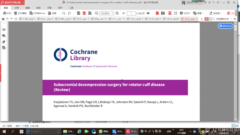 肩关节镜下治疗肩袖疾病的疗效仍然是热点问题。Cochrane 发表的一篇系统综述比较了关节镜下肩峰减压术对比安慰剂和保守治疗肩峰撞击症的临床疗效。共纳入8个随机对照试验(RCT),共纳入1062名患者,最后结论是:术后1年内肩峰下减压手术在控制疼痛、肩关节功能恢复或与健康相关的生活质量方面没有明显的优势。在所有研究中,肩峰下减压手术并发症的发生率均较低,与关节镜检查安慰剂组的不良事件发生率无差异(小于等于3%)。本研究的主要局限性(与所有涉及关节镜假手术的试验一样)是不清楚安慰剂组的益处来源是关节镜本身还是手术冲洗的效果。