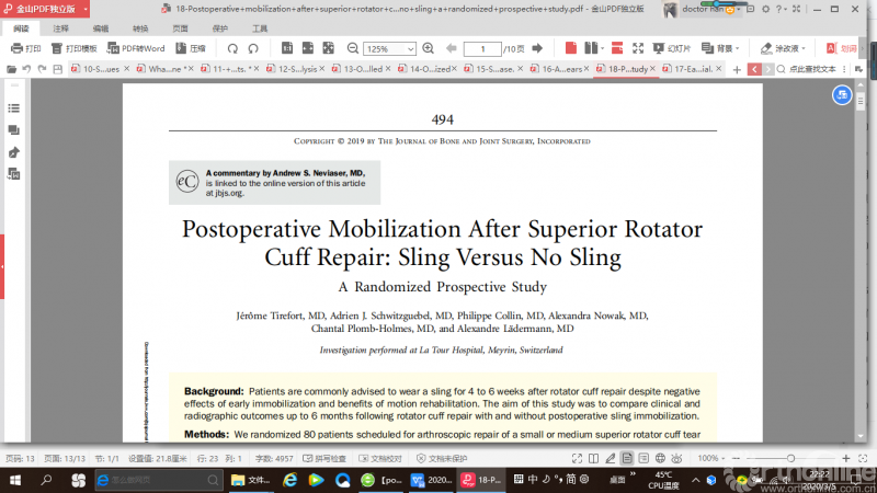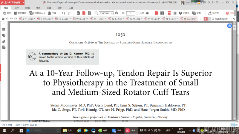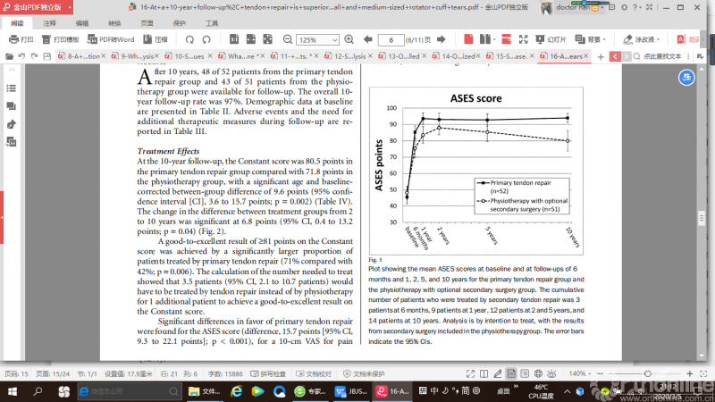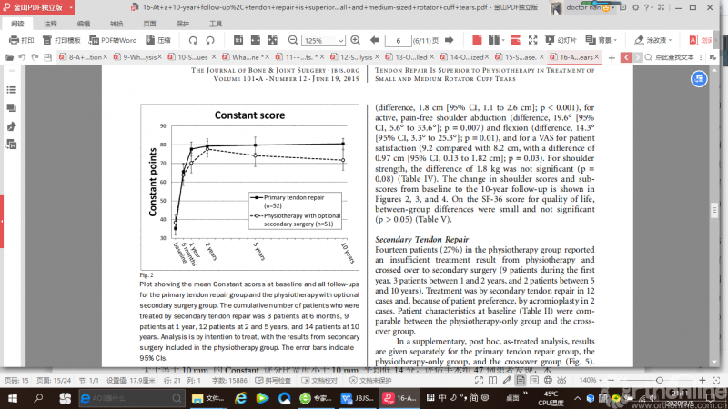 再纳入研究的103例患者中共有91例患者(修复组48例,物理治疗组43例)随访到了术后十年的数据,Constant score 评分手术修复组比物理治疗组高9.6 分,手术修复组的优良率 (71%) 高于物理治疗组(42%)。手术治疗组ASES评分和VAS评分高于物理治疗组。肩关节肌肉力量2组没有显著差异。作者得出的结论是,手术治理和物理治疗中小肩袖撕裂临床结果随着时间的推移而变化,因此对于中小肩袖撕裂的年轻人和活动要求高的人主张手术修复。