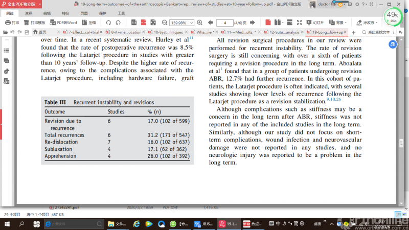 2019年JSES上发表的一篇系统回顾,随访了关节镜下Bankart修复术后的长期(10年)临床效果,结果显示:78%的患者术后重返运动,31%的患者出现复发性不稳定,17%的患者二次接受手术,总的来说关节镜下Bankart修复术具有良好的长期结果。但令人担忧的是,59% 的患者出现骨关节病,目前尚不清楚最初的创伤、手术过程或随后的不稳定哪个是引起骨关节病的主要原因,这是今后一个值得关注的问题。