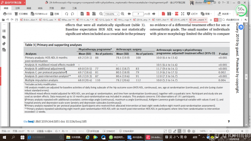 2019年BMJ杂志发表的一项随机对照研究(RCT)比较了髋关节镜手术和物理治疗+调整运动方式治疗髋臼撞击综合征的临床效果,共纳入222例患者(112人接受关节镜下手术治疗,110人接受物理治疗+调整运动方式治疗),术前2组患者基线相似,所有患者的影像学Kellgren-Lawrence分级均为0级或1级。术后随访8个月,188例患者(85%)获得完整的数据,手术组13例患者在规定时间内未进行手术,物理治疗组中有4例患者转入手术组。