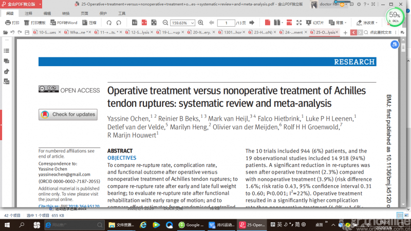 一项纳入随机对照研究(RCT)和观察性研究的系统综述和meta分析比较了急性跟腱断裂手术治疗和非手术治疗的再断率、并发症和功能恢复的结果。研究进行了敏感性分析,以评估再断率与早期或晚期完全负重的关系,以及有或没有早期活动范围的功能性康复。研究共纳入了10篇RCT研究和19篇观察性研究,共15,862 例患者(9,375接受手术, 6,487例患者非手术治疗),微创手术和开放手术都纳入了研究。29篇研究均报道了再断率,总体效果表明,手术治疗与非手术治疗相比,再次破裂率显著降低。