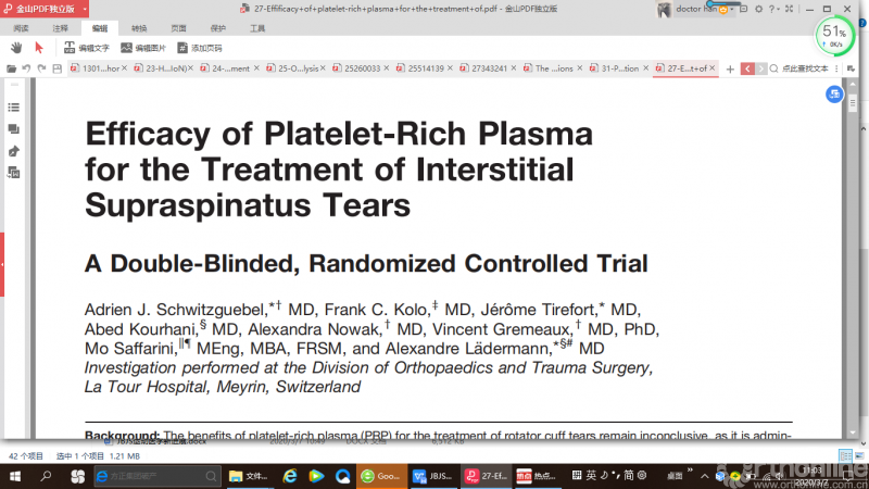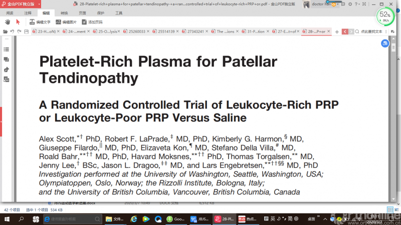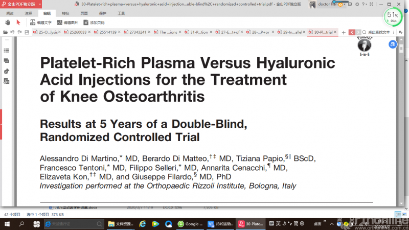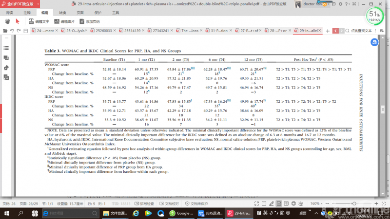 Lin等人进行了双盲RCT,随机选择了53名患者的87个膝关节,每周注射3次去白细胞PRP富血小板血浆、透明质酸或生理盐水。