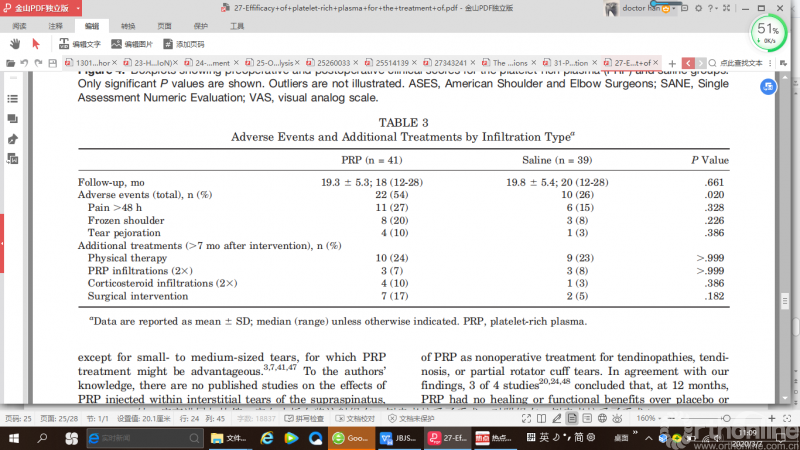 PRP注射组有更高的不良反应发生率,包括疼痛持续48小时以上,肩关节冻结,病变进展加快等,富血小板血浆注射组有7例患者接受了手术,对照组有2例患者接受了手术(p=0.182)。
