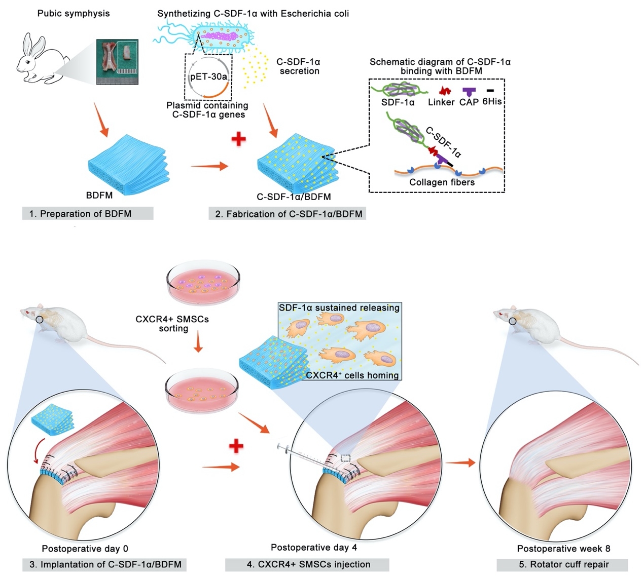 图2:分离兔耻骨联合中纤维软骨组织以制备脱细胞纤维软骨基质(BDFM);将胶原结合肽(CAP)融入基质细胞衍生因子-1α(SDF-1α)合成具有高胶原亲和力的重组趋化因子SDF-1α(C-SDF-1α);把C-SDF-1α结合于脱细胞纤维软骨基质内的胶原上,构建出一种可持续募集干细胞并具备成软骨活性的脱细胞纤维软骨基质移植物(C-SDF-1α/BDFM),用于修复大鼠巨大肩袖;分选出能被SDF-1α募集的大鼠CXCR4阳性滑膜间充质干细胞(CXCR4+SMSCs),待炎症反应消退后,注射入关节腔以促进肩袖止点再生。