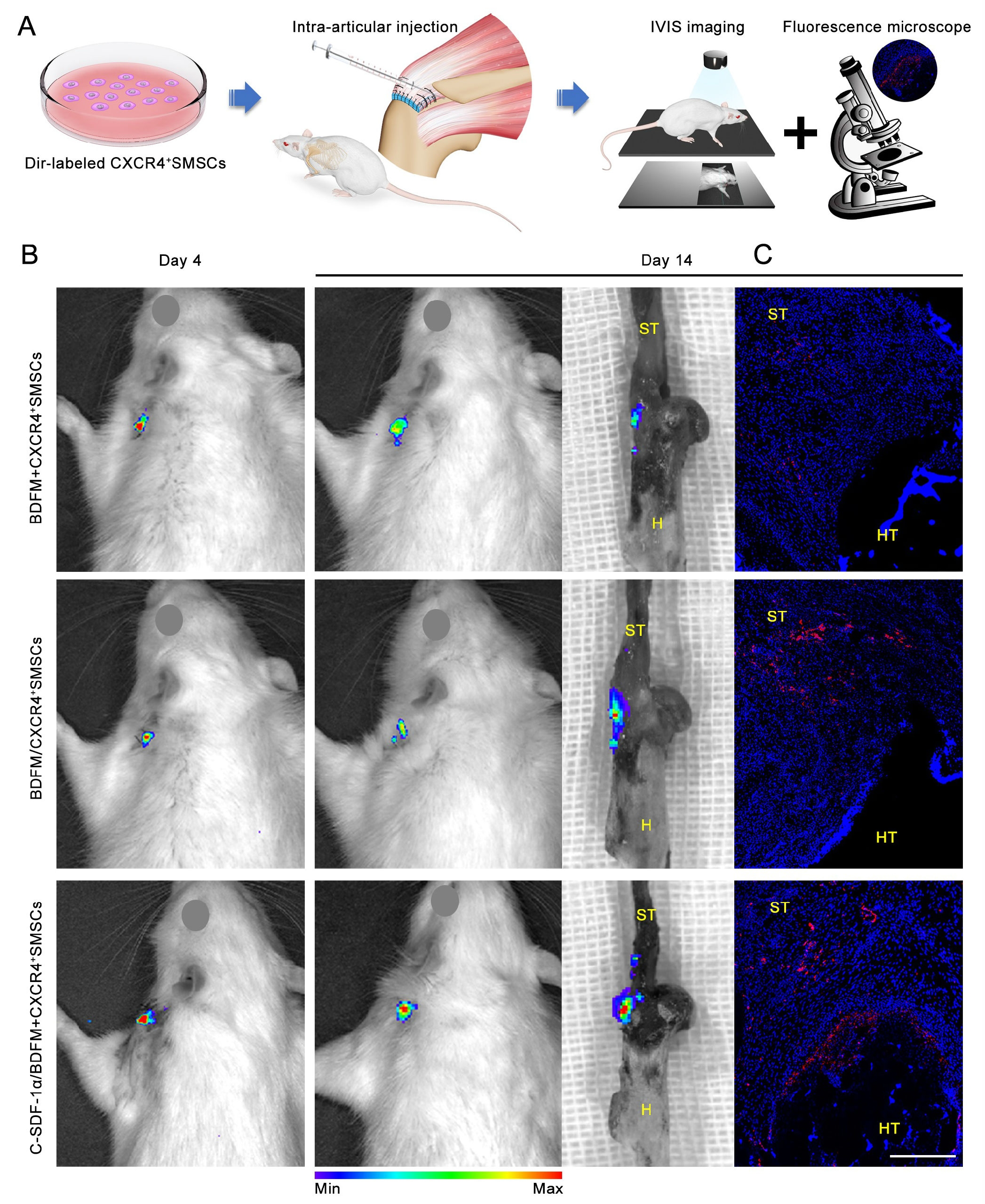 图3:利用Dil标记细胞示踪评估关节腔注射CXCR4阳性滑膜间充质干细胞(CXCR4+SMSCs)体内迁移情况。(A)评估流程示意图;(B&C)利用活体成像、免疫荧光观察Dil标记CXCR4+SMSCs植入体内14天的分布情况。脱细胞纤维软骨基质结合关节腔注射干细胞组(BDFM+CXCR4+SMSCs)、脱细胞纤维软骨基质体外负载干细胞组(BDFM/CXCR4+SMSCs)、干细胞持续募集脱细胞纤维软骨基质结合关节腔注射干细胞组(C-SDF-1α/BDFM+CXCR4+SMSCs)。