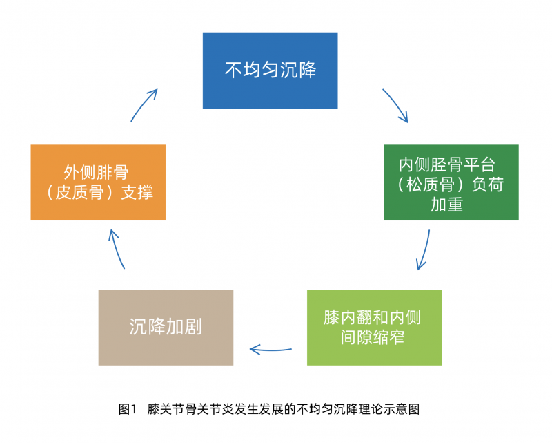 张英泽院士和他的团队,多年来经过解剖学、影像学、生物力学和临床应用等方面的系统研究,提出了不均匀沉降理论。该理论首先应用于膝关节内侧间室骨性关节炎的致病机制研究,指出骨质疏松是该病的始动因素,骨小梁变薄、数量减少,应力的传递与分散功能减弱,骨质难以承受巨大的压力发生微骨折,而外侧平台有腓骨支撑,导致平台内外侧沉降速率不一致。在临床上应用该理论,单纯应用腓骨近端截骨术治疗膝关节内侧间室骨性关节炎,取得良好疗效。