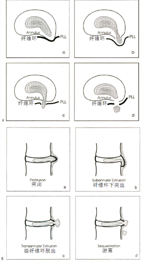 图1 A:包含型椎间盘突出的轴位像:a、椎间盘突出;b、椎间盘脱出。非包含型椎间盘突出的轴位像:c、经纤维环椎间盘脱出;d、椎间盘游离脱出。(PLL后纵韧带)。B:包含型椎间盘突出的矢状位像:a、突出;b、纤维环下突出。非包含型椎间盘突出的矢状位像:c、经纤维环椎间盘脱出;d、游离脱出。