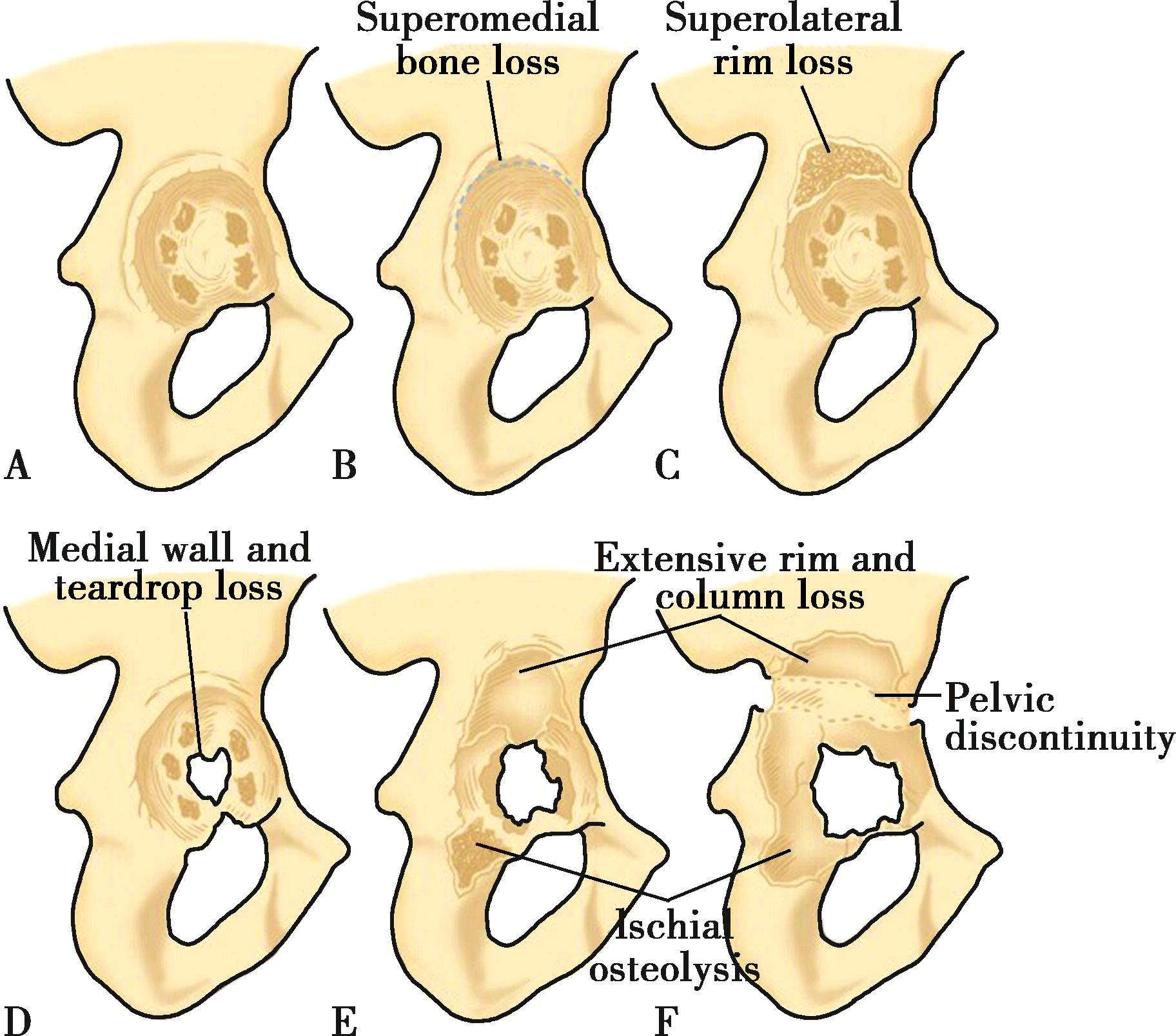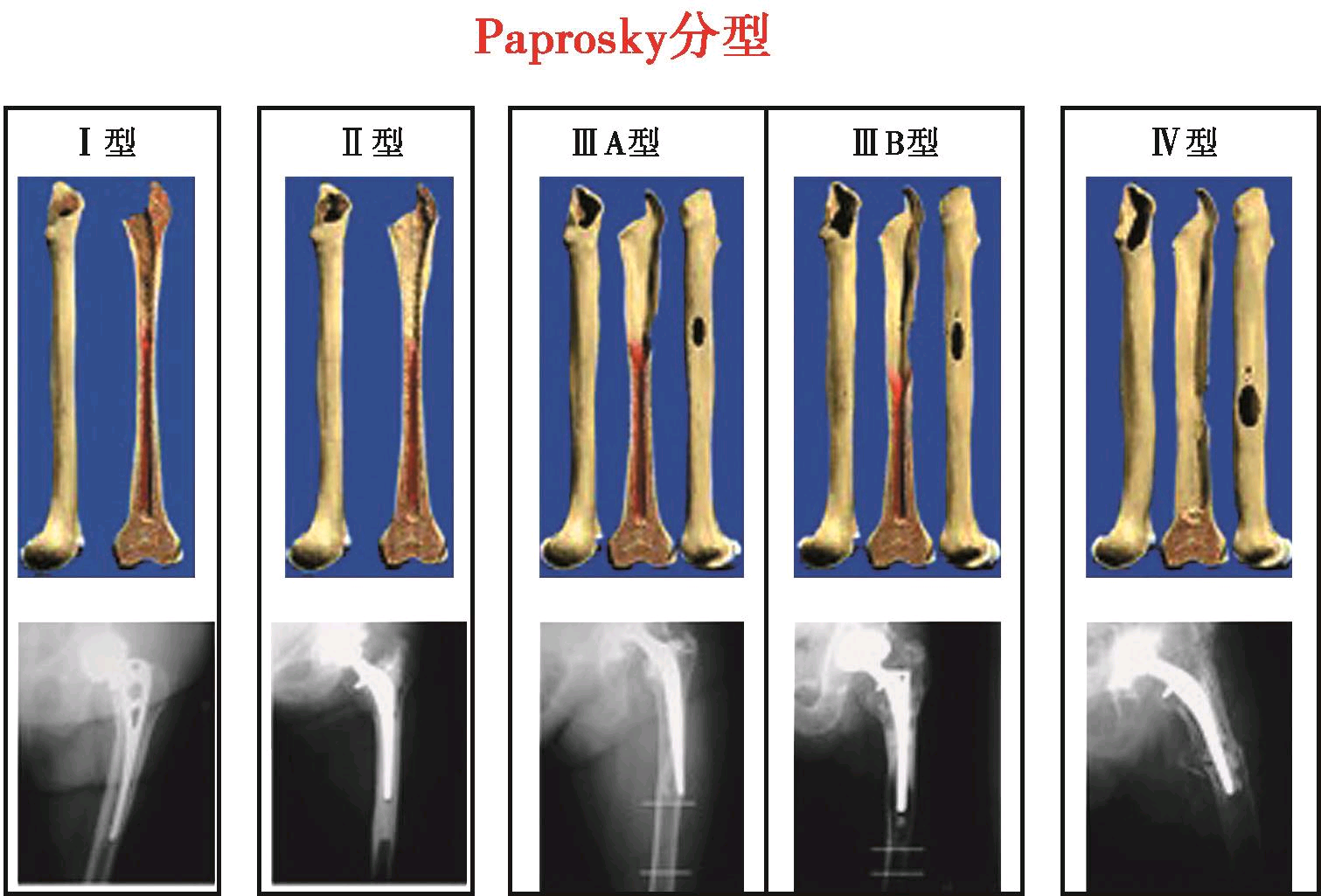 Paprosky分型将髋臼骨缺损分为三型:Ⅰ型:很小的骨溶解和移位,杯与骨接触大于90%;ⅡA型:向上移位小于3cm,臼内壁完整,边缘完整,轻度坐骨溶解,Kohler线完整,杯与骨接触大于70%;ⅡB型:向上移位小于3cm,臼内壁完整,边缘部分缺损,杯与骨接触大于70%;ⅡC型:向上移位小于3cm,臼内壁缺失,边缘不完整(<30%),杯与骨接触大于70%;ⅢA型:向上移位大于3cm,前后柱缺损,内壁缺失,骨缺损在10点~2点,杯与骨接触40%~70%;ⅢB型:向上移位大于3cm,严重前后柱缺损,内壁缺失,骨缺损在9点~5点,杯与骨接触小于40%,可有骨盆不连续。