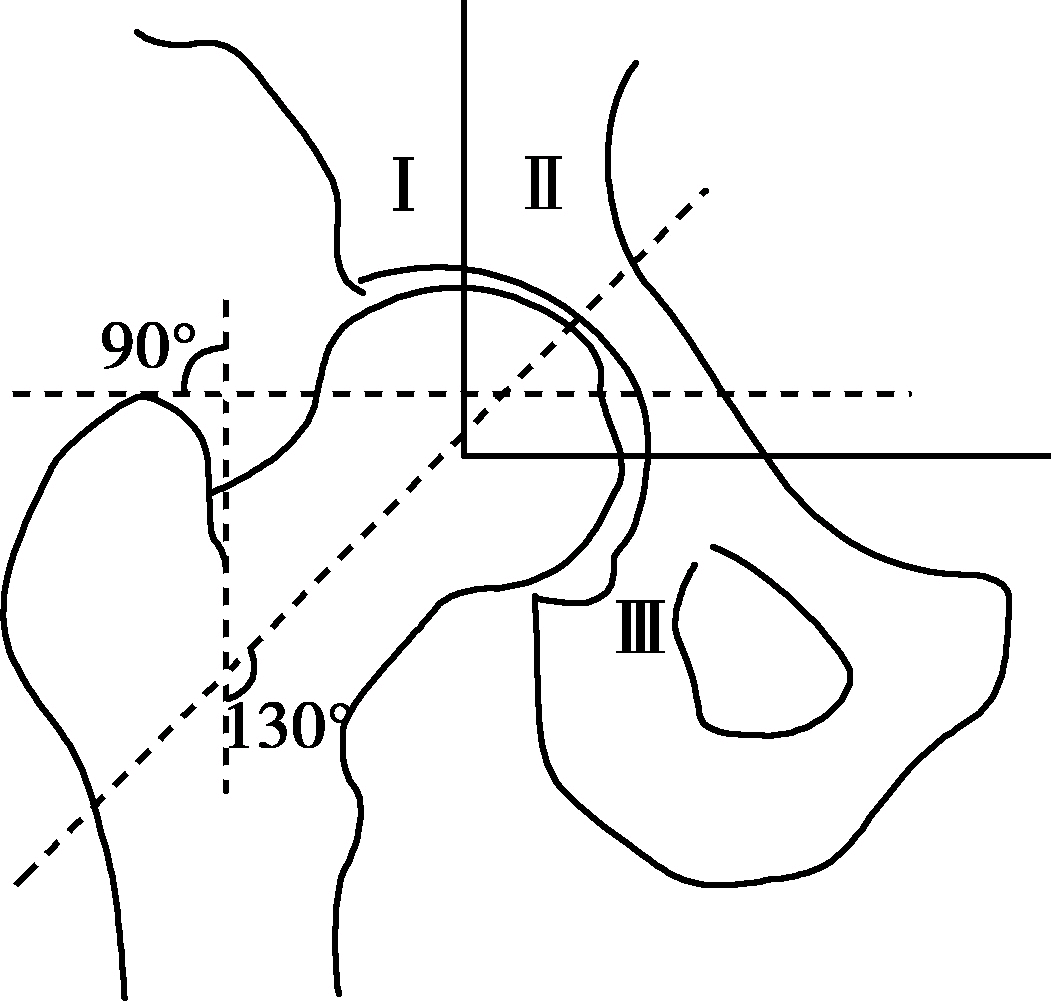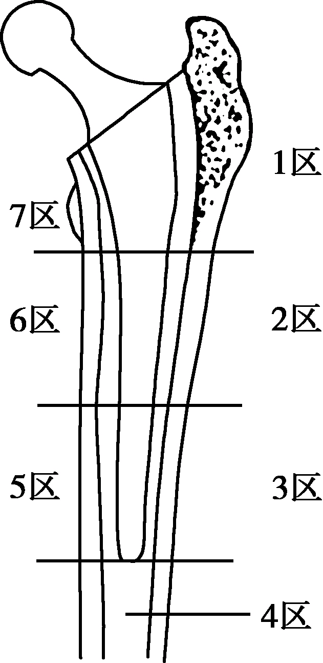假体松动的判定标准目前仍有争议,拍摄系列X线片与既往X线片对比观察评估已证明在判定假体移位或松动方面特别有用。根据Gruen的描述,股骨假体及其相关的界面被分为7个区域,内侧与外侧各3个区,柄尖端1个区;Delee和Charnley将髋臼分为三个区。以股骨头中心点为中心,作水平和垂直线,即将髋臼分为上(Ⅰ)、内(Ⅱ)及下(Ⅲ)三个区域。