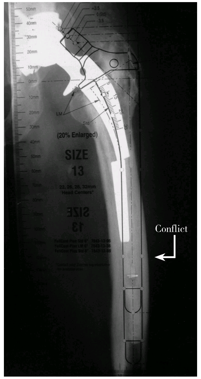 术前X线测量评估时一个重要而又易被忽略的部分是对股骨畸形的评估。松动的股骨假体常伴有股骨重塑(remodelling)致内翻和后倾畸形,而术前模板测量有助于辨识股骨重塑。图1-3-7所示:用模板测量时,植入假体柄的远端部分应放于股骨髓腔中央,柄的外侧边界与股骨外侧皮质之间的位置关系可以对比出来。如果假体接触或位于股骨外侧皮质之外,则提示发生了股骨内翻重塑,此时就应该决定在术中显露时做ETO,否则术中扩髓时将会有股骨穿孔的风险,若自髓腔植入假体尺寸不合适,还可能导致骨折。