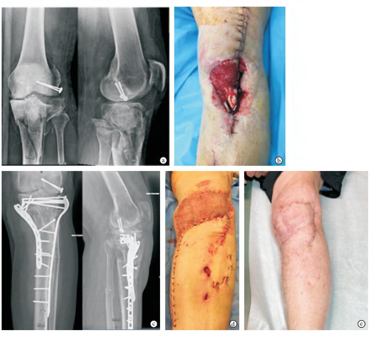 对该患者给予如下处理:首先,在股骨外髁及胫骨平台处切开复位内固定,然后用腓肠肌内侧头肌瓣转移覆盖膝关节前下方伤口,并在肌瓣表面行网状植皮。3周后植皮存活,伤口顺利愈合。术后10个月复查,骨折愈合,患者对膝关节功能满意。