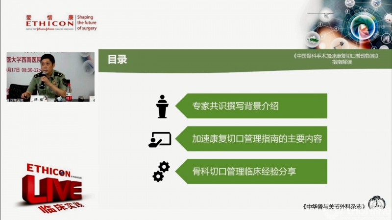 杨柳教授在“《中国骨科手术加速康复切口管理指南》解读”的专题中,详细介绍了该指南撰写背景和指南重要内容。该指南对骨科手术切口并发症危险因素评估、骨科手术切口缝合技术、各种常见切口并发症的定义、病因和防治都给出了指导性意见。