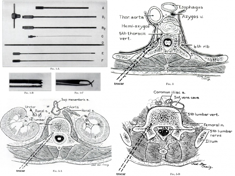 1931年,经过了反复的尝试,来自纽约的Burman博士首次描述了他发明的“脊髓内镜(spinal marrow’s endoscopy)”[1],而5年后,Stern也报道了他所发明的“脊柱镜(spinascope)”[2],二人开始为这一技术的实际应用开始进行解剖研究,而就在Burman和Stern在尸体腰椎标本上进行反复尝试的时间里,POOL则报道了他于1938-1942年间使用“脊髓镜(myeloscopies)”进行了400例检查[3]。由于当时缺乏图片记录能力,仅有手绘素描佐证他的工作。