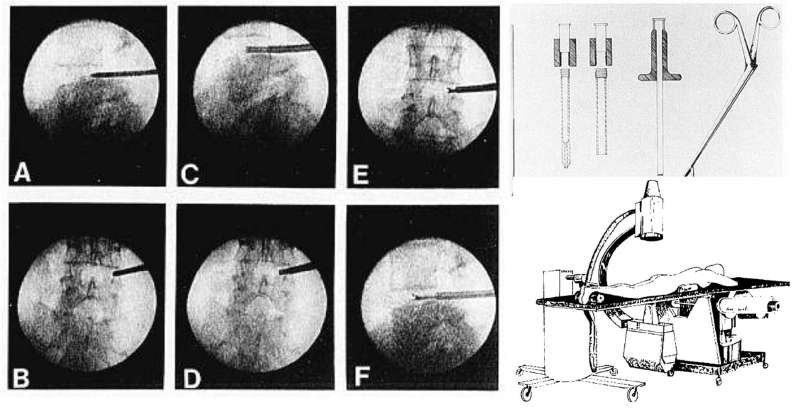 Kambin在进行临床总结后,觉得可以依靠内镜观察,通过这种外侧插入套筒进入椎间后进行髓核切吸术的方法解决椎间盘突出症。1980年10月,Kambin对之前的手术进行总结,在费城的“研究生医院(The Graduate Hospital)”创立了“经皮外侧间盘切除术(percutaneous lateral discectomy)。随后向费城研究生医院递交了临床试验许可申请,在1983年发表了他的首篇经皮侧方腰间盘切除术研究[7]。同年代(1975年),日本的Hijikata报道了“经皮髓核切除术(percutaneous nucleotomy)”对突出间盘进行切除减压[8],在日本发表了首篇经皮脊柱内镜间盘摘除的手术技术研究。可以认为,他们二人是现代经皮脊柱内镜技术最早的开拓者。