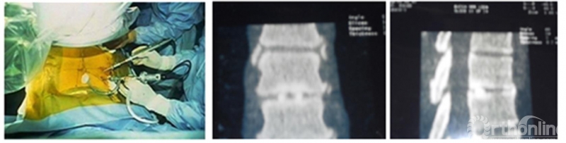 图5. Osman的单侧双通道内镜手术图及自体骨融合。引自Osman SG, Schwartz JA, Marsolais EB. Arthroscopic discectomy and interbody fusion of the thoracic spine: A report of ipsilateral 2-portal approach. Int J Spine Surg 2012; 6:103-109.