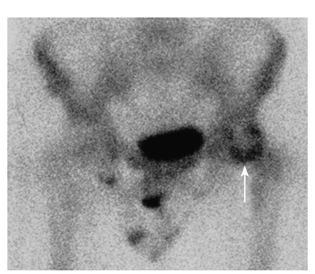 可用于诊断早期骨坏死,敏感度高而特异性低。采用99mTC-MDP扫描,热区中有冷区即可确诊。仅有核素浓集(热区)则应与其他髋关节疾病鉴别。此检查可用于筛查早期及多灶性骨坏死。单光子放射断层扫描(SPECT)可增加敏感度,但特异度仍不高。