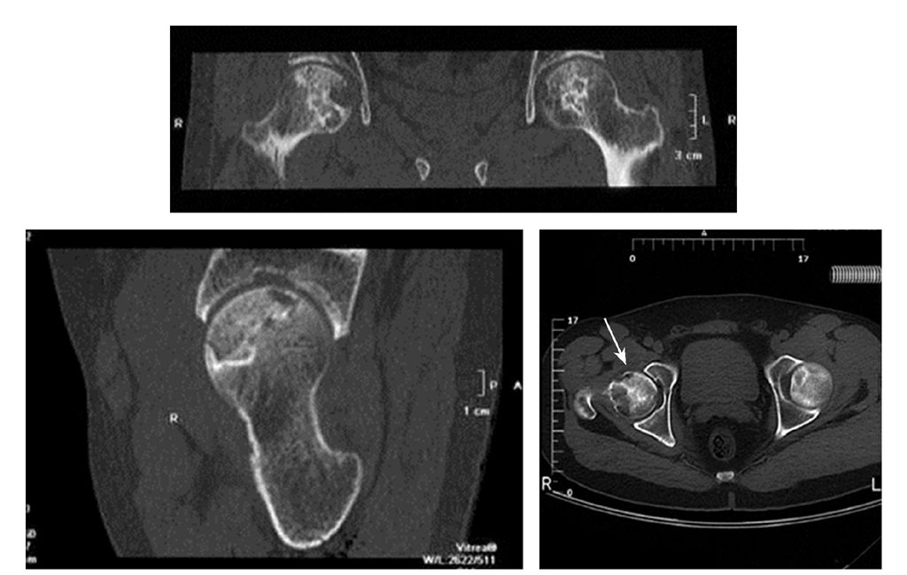 CT扫描可清楚显示坏死病灶及修复情况及软骨下骨折(↑)
