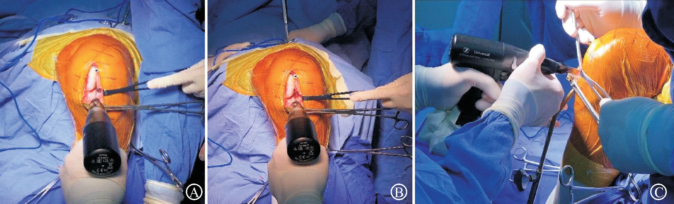图A示锯片紧挨内侧髁间嵴内侧;