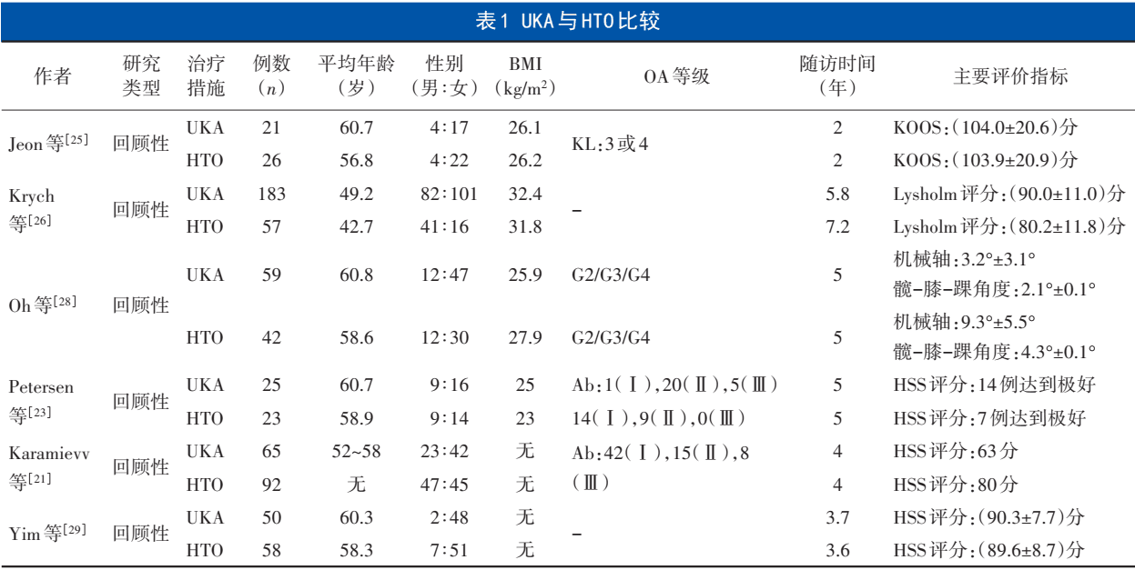 UKA和HTO治疗单间室关节炎疗效一致存在争议,但近年来越来越多的研究发现,在适应证把握合理时,UKA比HTO更具优势,主要体现在:①UKA能从根本上阻断OA的进展,而HTO只能延缓其发展[21];②UKA术后功能评分、疼痛评分和生活质量等明显好于HTO[22,23];③近年来UKA手术技术逐渐成熟,发展比HTO快[24]。但是,UKA也存在一定的缺点:①运动量较大者不适合UKA,年龄<60岁不建议行UKA[12,25];②UKA相比于HTO需要更早进行TKA翻修,且翻修率较高[5,26];③UKA的价格也高于HTO[27]。虽然两种手术都能让部分患者获得满意的疗效,但应综合考虑患者年龄、BMI、OA等级和患者活动水平等,以制定个性化的治疗方案[28,29]。UKA与HTO比较的最新研究见表1。