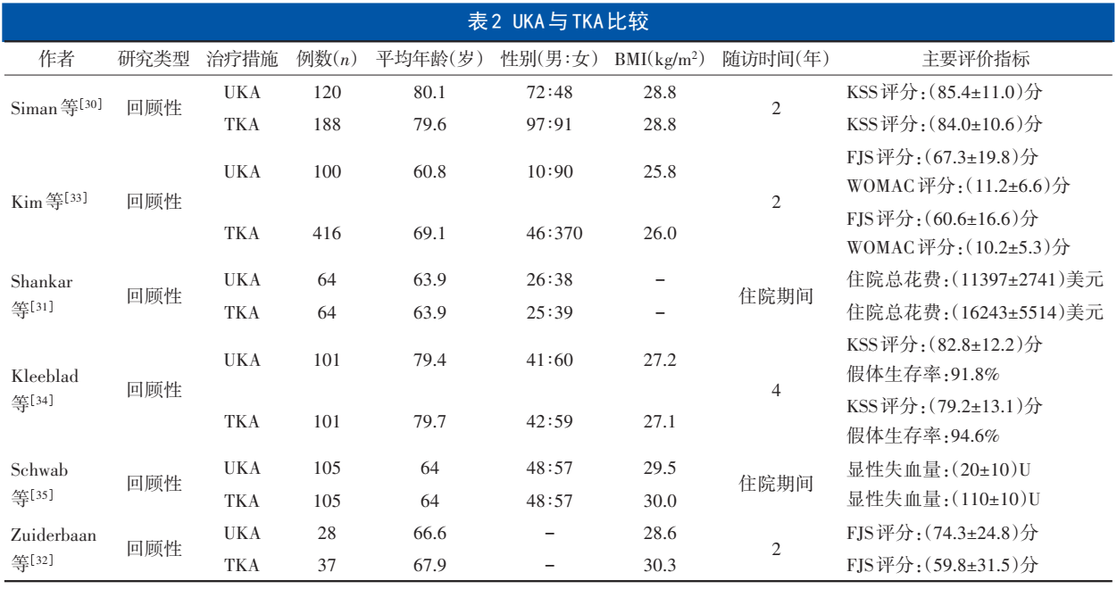 TKA作为OA终末期治疗方式,对于膝OA和多间室病变疗效确切。但对于单间室病变患者,选择UKA或TKA尚无定论。相比于TKA,UKA主要优势为:①手术切口小、手术时间短、术后恢复快[30];②术中和术后出血量少、输血率低[31];③住院时间短,具有更好的成本效益[31];④并发症也明显少于TKA[30];⑤能够保留患者前后交叉韧带,减少截骨量和局部组织破坏量,术后患者本体感觉恢复好,行走功能恢复较快且好[32];⑥远期运动功能更接近生理状态[33]。但UKA也存在如下不足:①适应证范围较TKA小,只有单间室OA患者可以采用UKA[5];②翻修率较TKA高[34]。综上,在临床实践中,需要严格把握适应征,在做出选择前应综合考虑患者的年龄、病程等[34,35]。UKA与TKA比较的最新研究见表2。