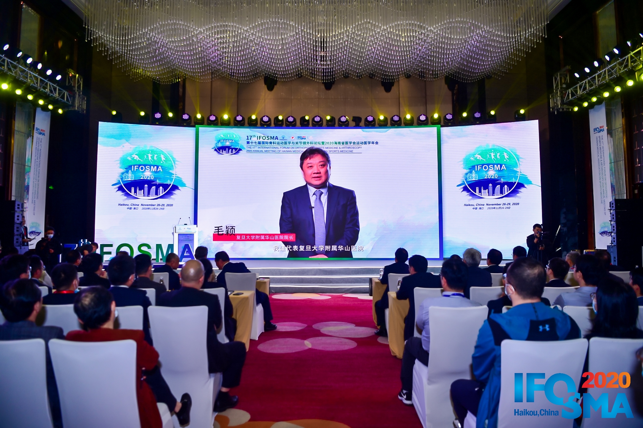 复旦大学附属华山医院毛颖院长也通过视频形式致辞。他表示,自2002年创办起,IFOSMA大会在陈世益教授的带领下已经发展成为中国运动医学学术交流和引领潮流的标志性会议之一。本次大会能在国家“一带一路”战略支点城市海口市与海南省人民医院共同合作举办,彰显了华山医院在运动医学方面希望与全国展开更广泛的交流与合作,促进国内运动医学水平更上一层楼。