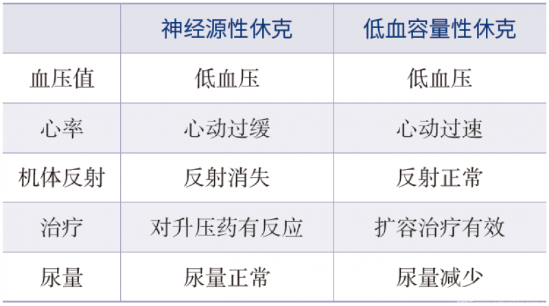 表1 神经源性休克和低血容量性休克之间的异同