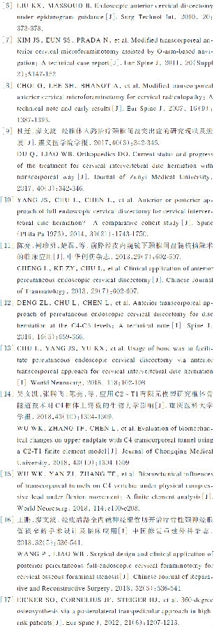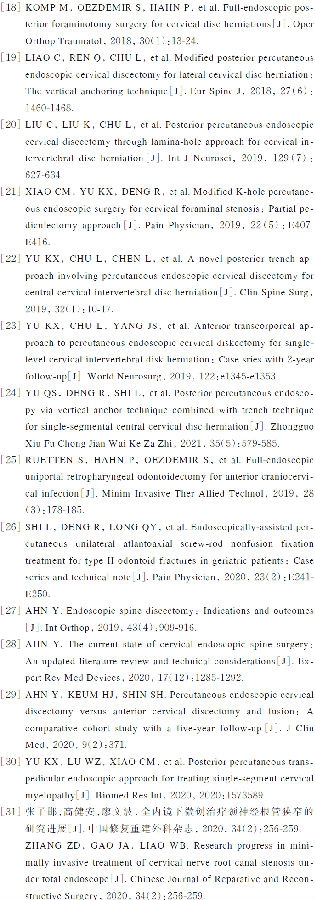 目前颈椎病的微创内镜手术减压技术已经初步成熟[23-24,27-31],能够解决颈椎病常见局限性神经血管等器官组织的压迫。对技术本身的规范操作方面的优化,和技术培训推广方面的系统化和标准化,以及相关手术器械和设备的改进与智能化等工作,已经成为当前较为紧迫的任务。