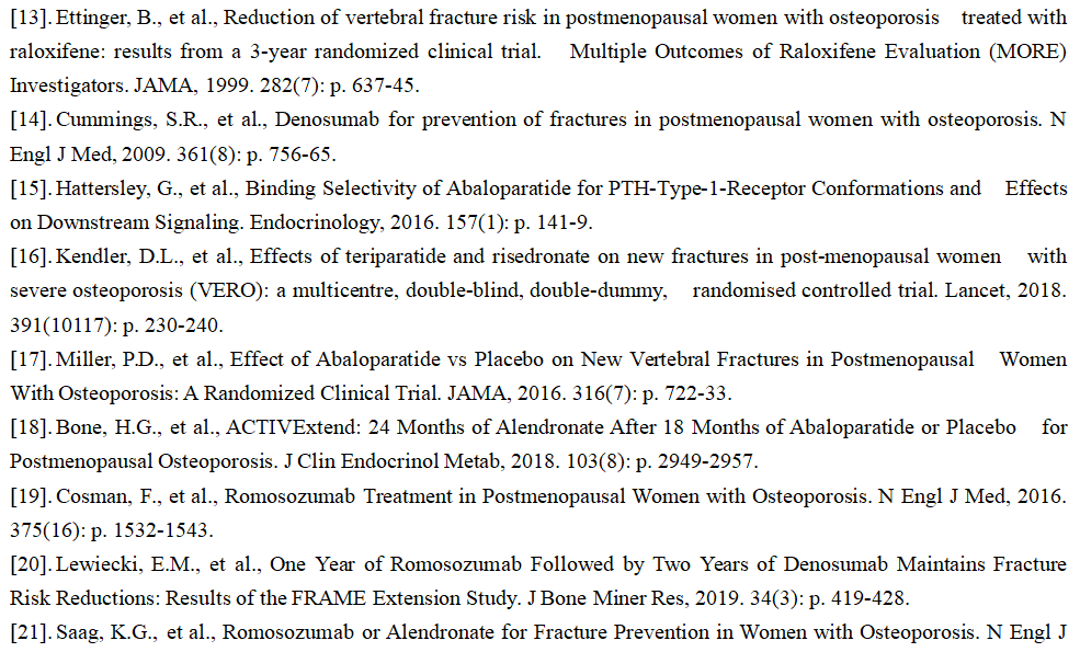 阿巴洛肽是一种合成的34氨基酸肽,与PTHrP1-34同源性为76%,与PTH1-34的同源性为41%,是继特立帕肽后第二种促骨形成药物。ACTIVE研究证实[17],在为期1.5年的治疗后,阿巴洛肽可显著降低绝经后妇女新发椎体骨折、非椎体骨折、主要骨质疏松性骨折及临床骨折的发生率,并能够显著提升绝经后妇女髋部、股骨颈及腰椎骨密度,且疗效优于特立帕肽。ACTIVE延伸研究证实[18],使用阿巴洛肽1.5年后序贯以阿仑膦酸钠治疗2年,椎体等部位新发骨折风险显著下降,并可使腰椎及髋部骨密度持续上升。与特立帕肽相比,阿巴洛肽治疗后高钙血症的发生率较低(3.4% vs 6.4%),该差异可由阿巴洛肽与R0-PTHR1构象结合的高选择性和与RG-PTH1R构象结合的高亲和力解释。该药于2017年4月由美国FDA批准并上市,用于治疗绝经后骨质疏松症和骨折高危女性,在我国尚未批准上市。