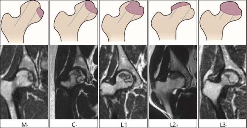 2014年12月,中华医学会骨科学分会关节外科学组组织国内骨坏死研究及诊疗专家讨论,制订了《股骨头坏死临床诊疗规范》[10],提出了中国分期;同时,推荐使用ONFH的CJFH分型[16]和中国分期。见图1,表2。CJFH分型按ONFH累及三柱结构的部位进行分型:M型(内侧型),坏死灶累及内侧柱;C型(中央型),坏死灶累及中央柱及内侧柱;L1型(次外侧型):坏死灶累及三柱,但外侧柱有部分存留;L2型(极外侧型),坏死灶累及外侧柱及部分中央柱;L3型(全股骨头型),坏死带穿透整个股骨头三柱皮质及骨髓。CJFH分型结果不会受解剖变异及位置移动的影响,且对ONFH塌陷预测的准确性高,对治疗方案的选择具有临床实际指导意义,应用简便、可重复性强。