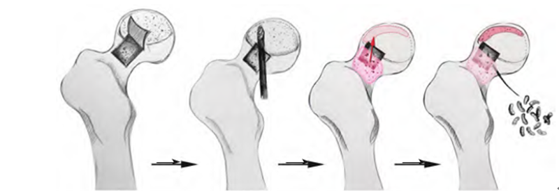 3.2.2游离骨移植术 游离骨移植术也常用于治疗早期ONFH,手术去除坏死组织,植入自体骨、同种异体骨、骨替代材料或生物诱导骨基质如BMP-2[26],为股骨头提供结构支撑,并具有骨诱导和骨传导功能,有助于股骨头坏死灶的成骨修复。常用手术方式有股骨头颈部开窗病灶清除打压植骨术(图2)。