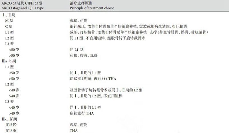 ②依据ONFH分期(ARCO分期)、分型(CJFH分型),治疗选择原则见表3。