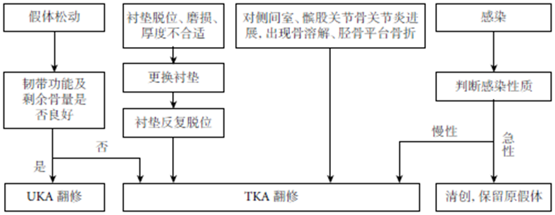 当仅存在假体松动,而侧副韧带和ACL功能完好、骨量剩余充足、对侧间室无骨关节炎进展时,可采用UKA翻修。与TKA翻修相比,采用UKA翻修后患者关节功能评分、生活质量、并发症和生存率更令人满意,但假体生存率及再翻修率仍需关注,需要严格选择手术适应证。