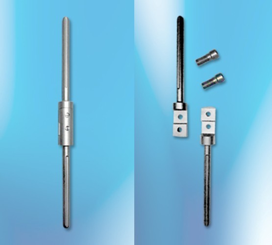 节段型人工假体(intercalary prosthesis)可以使患者早期恢复肢体功能,提高患者的生命质量,是一种较为理想的骨干缺损重建方法之一。1979年Abudu等第一次应用节段型人工假体以来,英国、美国、日本、德国等先后进行了多种假体的设计和制作,但假体的主要部件仍然是由远端髓腔柄、近端髓腔柄、连接螺钉等组成(如图)。