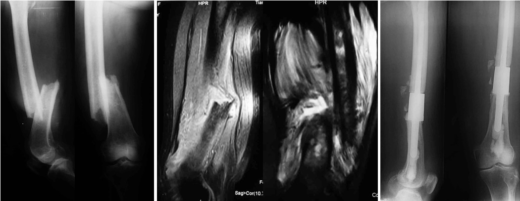 为提高长骨骨干恶性肿瘤的治疗效果,肿瘤切除后如何有效的重建骨缺损应当引起重视。首先,相对于关节附近或脊柱来说,骨干原发性恶性肿瘤包括转移瘤很少见,难以获得足够的临床经验;其次,骨干恶性肿瘤节段性切除后,骨缺损通常较大,自体骨或异体骨移植重建方法存在骨愈合时间长、骨折、固定较困难等问题;再次,骨干恶性肿瘤的邻近关节结构完好,儿童骺板未受破坏。所以,重建方法必须要保证术后邻近关节功能,保留骺板使患肢依然具有生长潜能,这对提高术后功能具有重要的意义。