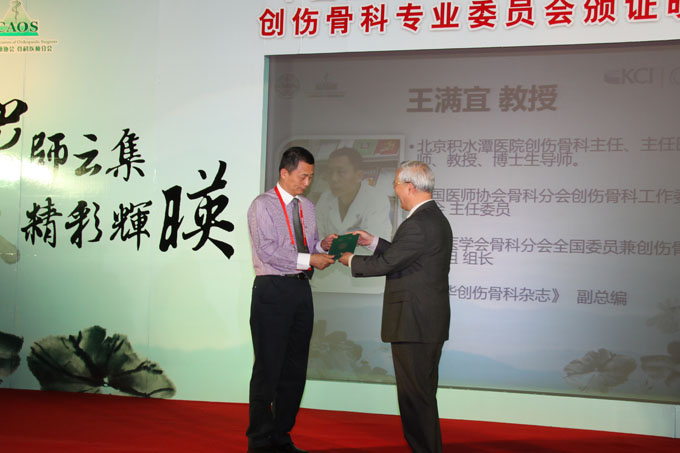 曾炳芳教授为王满宜教授颁发创伤骨科工作委员会主任委员证书