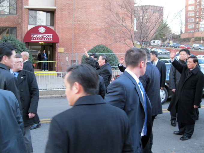 王岐山在下榻的万豪酒店门口向欢迎人员挥手