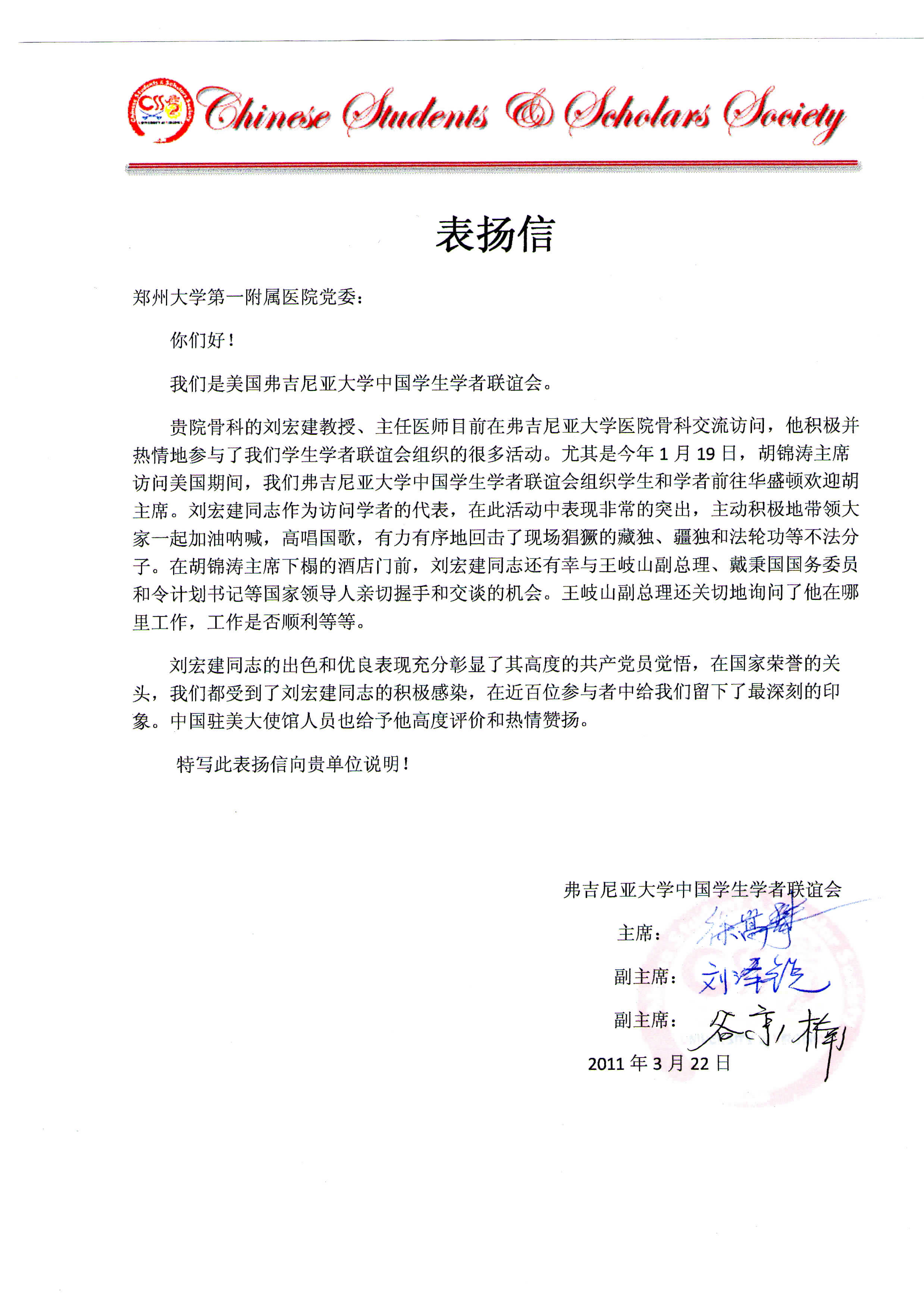 刘宏建教授还积极参加了弗吉尼亚大学中国学生学者联谊会组织的很多活动;尤其在2011年1月19日,胡锦涛主席访问美国期间,刘宏建教授作为访问学者的代表,在欢迎胡主席的活动中表现突出,获得了美国弗吉尼亚大学中国学生学者联谊会寄出的表扬信。