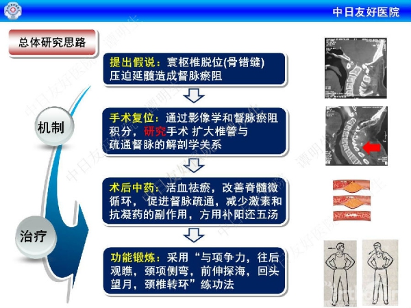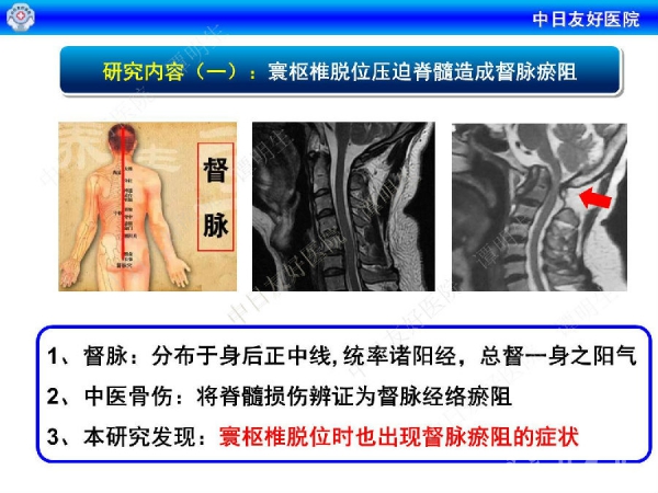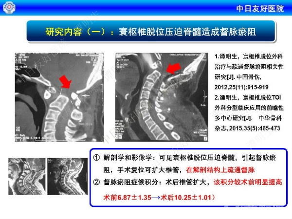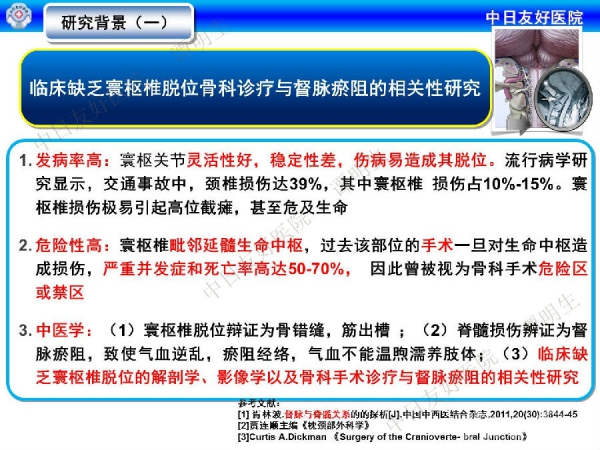 寰枢椎脱位是指先天畸形、创伤、退变、肿瘤、感染炎症和手术等因素造成的寰椎与枢椎(第一和第二颈椎)骨关节面失去正常的对合关系,发生关节功能障碍和(或)神经压迫的病理改变。一直以来,临床缺乏寰枢椎脱位骨科诊疗与督脉瘀阻的相关性研究。在诊疗时,传统手术死亡率高,而中医手法和外固定疗效不明显。针对这种情况,中日友好医院谭明生教授介绍了他们的研究进展。