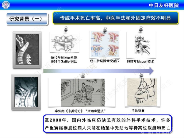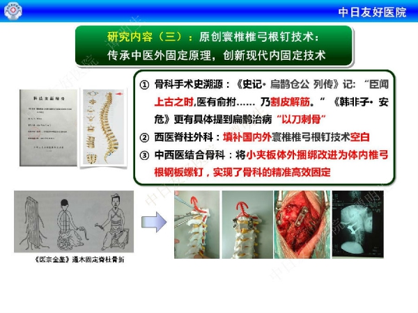 ③中西医结合骨科:将小夹板体外捆绑改进为体内椎弓根钢板螺钉,实现了骨科的精准高效固定
