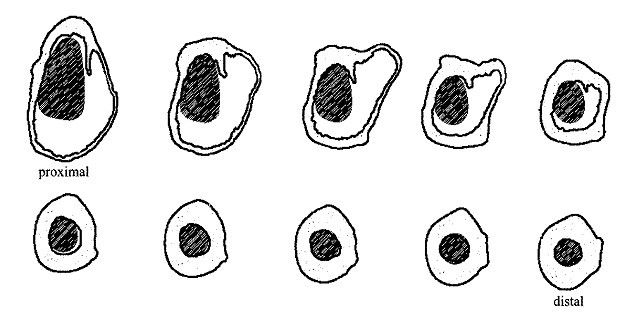对于全髋关节置换术,假体股骨柄与股骨近端髓腔的匹配是假体初始稳定性及远期生存率的重要保证,而决定股骨近端髓腔大小和方向的因素主要是股骨距[7]。股骨距是股骨近段内侧的一个重要的承重结构,1874年由德国解剖学家Friedrich Merkel首先报道。在股骨近端发育的过程中,小粗隆是在髂腰肌的牵拉作用下形成的,这一牵拉作用同时也将该部的股骨内侧皮质分为了明显的两层:外层的皮质骨和内层的股骨距。两层在近侧汇合形成内侧股骨颈[8]。国内王震宇、戴克戎[9]于1994年通过CT扫描进行了股骨距与股骨近段有效髓腔的形态学研究。研究发现股骨距位于股骨上段内部,呈板状突起,起于股骨颈后外侧皮质呈不规则走形向前下止于小粗隆下方,将股骨近端髓腔切分为前外和后内两部分,而股骨柄插入髓腔时真正进入的是前外侧髓腔(见图1),股骨距作为后侧壁。无论是用骨水泥型还是非骨水泥型生物假体,都要求假体柄与髓腔前外侧紧密接触,对于非骨水泥型假体更是如此,压力负荷经过股骨近端传导,一方面可减少近端的应力遮挡效应,另一方面也避免远端的应力集中而致大腿疼痛或假体周围骨折。国内左建林[10]等对股骨近端髓腔各侧壁的倾角、股骨距走形等进行了详细的研究,得出股骨柄假体应设计成直形而非解剖形。