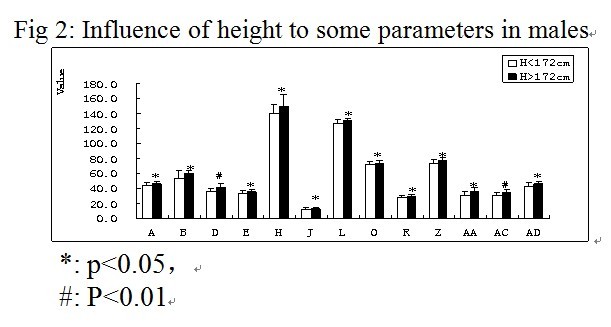 股骨与胫骨解剖参数见表1,部分参数间相关性分析见表2、3。身高和BMI对男性、女性相关参数的影响(见图2-5),本研究测量的相关结果与国内外资料比较见表4。