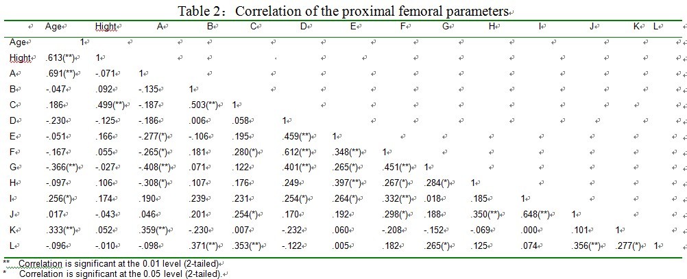 部分参数间的相关性分析见表2、3。股骨头高度与股骨距、颈干角有很强的相关性,颈干角大者,自然其股骨头高度要大,另外测量过程中发现,男性的颈干角要大于女性,加上身高的因素,股骨距也要大。股骨髁前后径、股骨髁长度与胫骨平台左右径、内外侧平台前后、左右径均呈强相关性,任何个体的股骨远端和胫骨近端都是匹配的,故测量的股骨远端与胫骨近端数据呈明显的相关性。