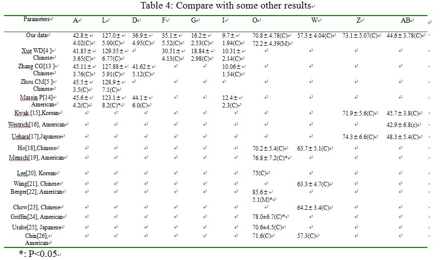 测量数据显示,与白种人相比较[14、17、19、20、22、24、25、26],中国人的颈干角明显大于白种人( P <0. 01),而股骨头直径无显著性差异(P>0.05),股骨近端各截面大小虽然较白种人小,但无统计学意义,然而,股骨远端和胫骨近端的数据要明显小于白种人,且有统计学意义(P<0.05)(表4)。另外,股骨头高度的恢复对保持双下肢等长、髋关节周围肌力平衡和髋关节的稳定非常重要,因此,设计关节假体必须充分考虑这个重要因素,但是目前我国临床使用的假体多为欧美设计款,故在术前计划时要充分考虑假体与国人间的差异,以便更好地恢复股骨头中心。