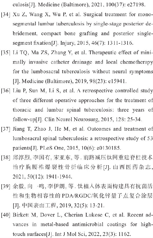 目前,普遍认为腰骶椎结核后路手术具有风险小、手术时间短、出血量小等优势,但仍有研究者选择前路手术进行腰骶椎结核的病灶清除。