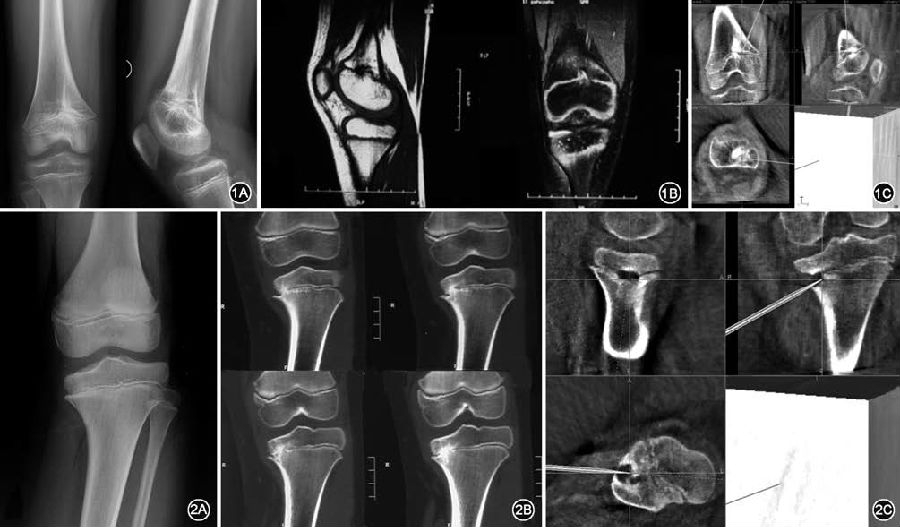 图1 10 岁男性股骨远端骺早闭,术前影像与术中导航相匹配 1A.术前X 线片显示股骨远端偏内侧骺早闭,形成中央型骨桥;1B.术前磁共振示在矢状位和冠状位上骺线中断,骨桥形成;1C.术中导航影像清晰显示出冠状位、矢状位、水平位的骨桥位置,图中所指为磨钻到达位置,引导下进行磨除  图2 11岁男性胫骨近端骺早闭,术前影像及术中骨桥磨除后再次导航确认 2A.受伤3 年后逐渐出现胫骨近端内翻畸形,术前平片未发现明确骨桥;2B.术前CT 检查发现胫骨近端部分层面可见边缘型骨桥;2C.术中磨除骨桥后再次导航,骨桥部位已变成空腔,术中应用指示器于空腔内各点确认骨桥完全磨除