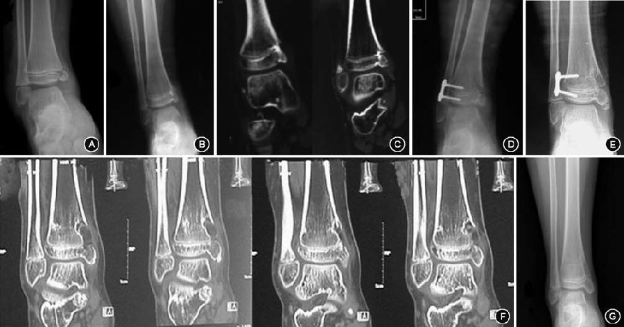 图3 7岁男性胫骨远端骺早闭,术前影像及术后随访 3A.外伤造成胫骨远端内侧骺损伤,原始损伤时的X线片;3B.伤后8个月出现踝内翻畸形,术前X线显示形成边缘型骨桥,内踝形态异常;3C.术前CT证实胫骨远端内侧存在骨桥; 3D.导航下行胫骨远端内侧骨桥切除,外侧“8”字钢板固定,手术后平片; 3E.术后10个月畸形矫正,骨桥消失,内踝形态基本正常;3F.取出“8”字钢板后行CT检查,证实骨桥已被空腔替代,同时空腔向干骺端生长证明局部具有生长潜力; 3G.术后16个月复查,踝关节形态基本正常